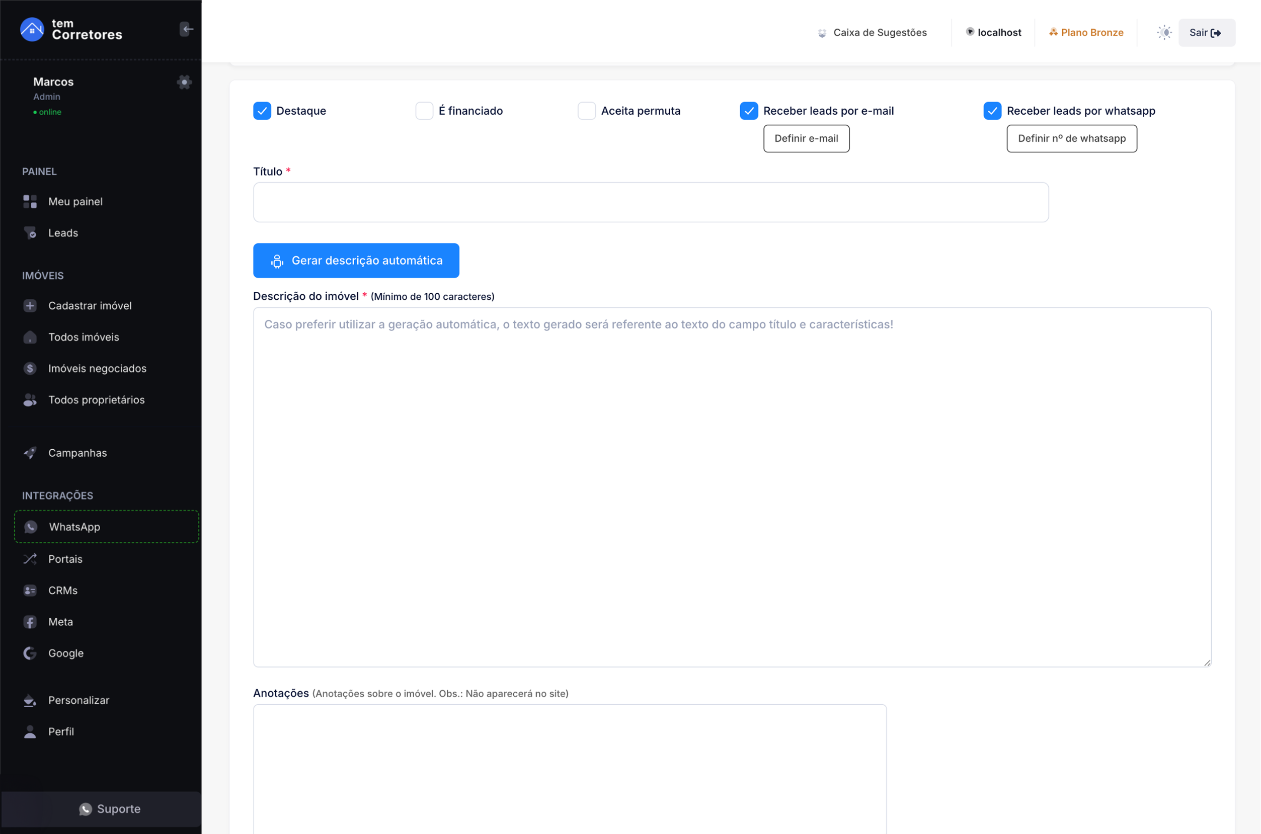 Crie descrições completas e atrativas para seus imóveis em segundos com o apoio da inteligência artificial. Basta inserir as informações principais, e o sistema gera automaticamente um texto profissional, destacando os melhores atributos do imóvel de forma clara e persuasiva. Transforme dados em textos que vendem mais, com agilidade, inteligência e eficiência.