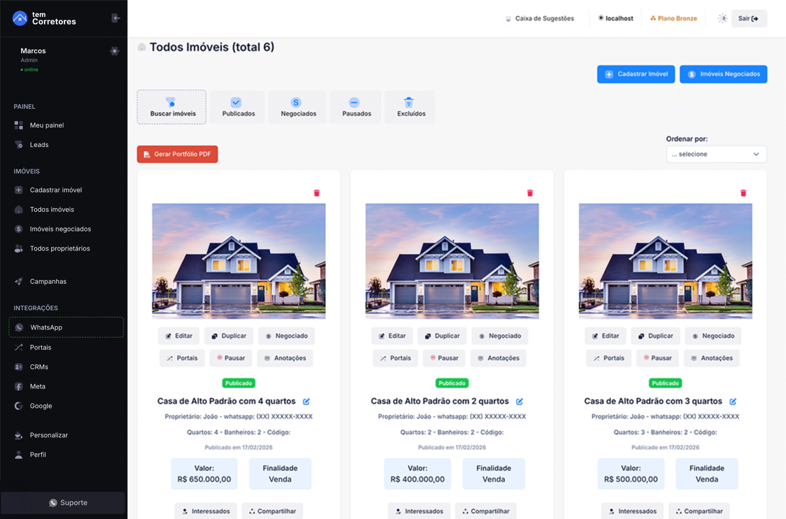 Gerencie seus imóveis e processos com total facilidade através de um painel intuitivo, moderno e totalmente integrado. Tenha acesso rápido a todas as funcionalidades, como cadastro, edição, status de negociação e acompanhamento em tempo real, tudo em um único lugar. Nosso painel foi pensado para que você foque no que realmente importa: fechar negócios, atender melhor seus clientes e tomar decisões com mais agilidade e segurança.